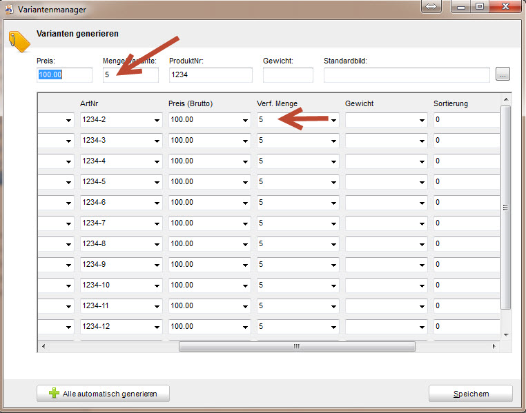 Sie können aber beim generieren von Varianten oben eine Default Menge pro Variante angeben. Das heißt Default 5 pro Variante ergibt dann bei 3 Varianten 15 Artikel im Artikelbestand. Siehe Screenshot.