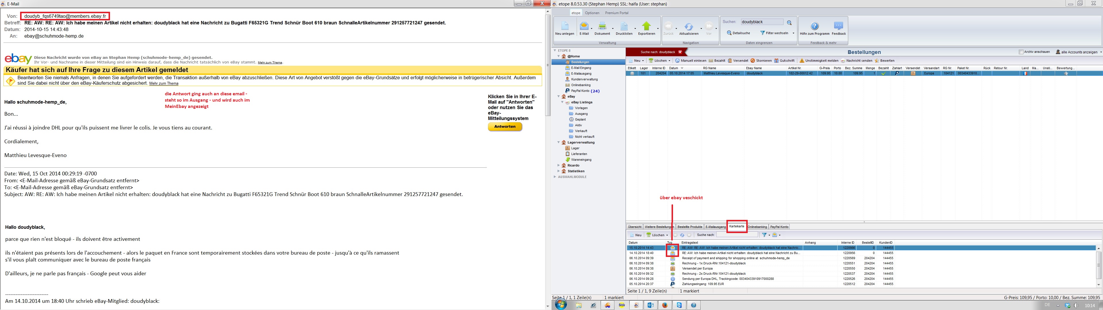 aber nur, wenn Du in der Mail auf Antworten gehst. Nur dann geht es über das ebay Nachrichtensystem. Hat aber nichts mit Etope zu tun und die Antwort taucht auch nicht in der Karteikarte auf (sofern der Kunde bereits gekauft hat)